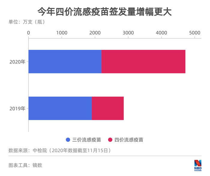 2019年流感季,三价、四价流感疫苗的签发量分别为1904.01万支(瓶)和960.54万支(瓶),但今年(数据截至11月15日,下同)中检院批签发的三价、四价流感疫苗的数量已分别达2194.50万支(瓶)和2525.81万支(瓶),分别是去年的115.26%和262.96%。也就是说,三价流感疫苗的数量已超过去年水平,四价的增长更是凶猛,轻松翻倍。