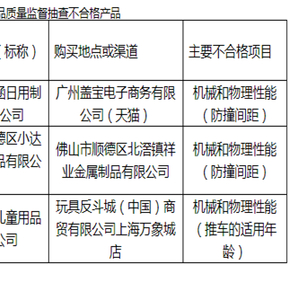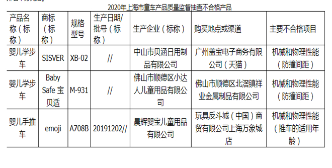 其中,商标为“SISVER”、“Baby Safe 宝贝适”两款婴儿学步车均存在机械和物理性能(防撞间距)不合格的问题,标称生产单位分别是中山市贝涵日用制品有限公司、佛山市顺德区小达人儿童用品有限公司;商标为“emoji”的婴儿手推车存在机械和物理性能(推车的适用年龄)不合格的问题,标称生产单位为晨辉婴宝儿童用品有限公司,由玩具反斗城(中国)商贸有限公司上海万象城店销售。