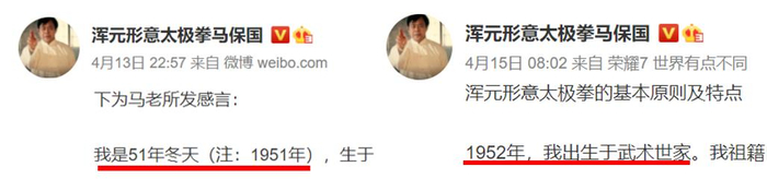 他自称是浑元形意太极门掌门人。时而出生于51年,时而出生于52年,不过这不重要,我们知道他69岁就好。马老师祖籍山东,长于河南,在英国发迹,后转战国内比武,取得了一系列骄人的败绩。