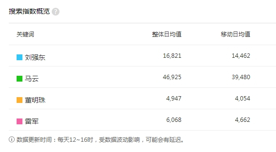 而就算是从网络曝光度来说,董明珠“自恋”这一结论也有待商榷。文章将董明珠与美的集团方洪波、海尔集团张瑞敏进行对比,似乎这样的选择也存在一定的主观性。从百度搜索指数来看,马云、刘强东的网络热度远高于董明珠,而小米集团雷军的网络热度似乎和董明珠不相上下。
