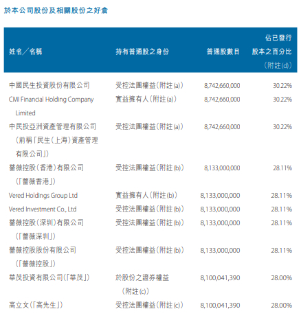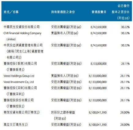 2019年中报显示,截至2019年6月30日,蔷薇控股通过蔷薇深圳-蔷薇香港……等一系列关系,最终持有中民金融28.11%的股份。