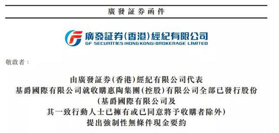 惠陶集团发布公告,广发经纪香港代表基爵国际提出强制性无条件要约及回应文件。