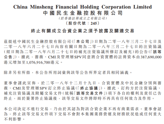 中民金融公告宣布,此前拟成立合资企业的事项终止。