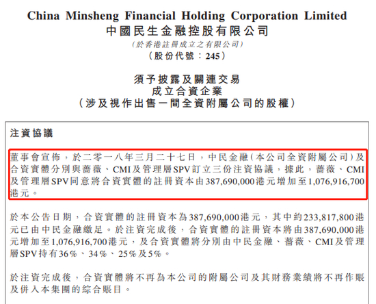 中民金融发布成立合资企业的关联交易公告称,旗下全资附属公司“中民金融投資管理有限公司”与“蔷薇”(“薔薇資本有限公司”)、CMI及管理层SPV订立注资协议。