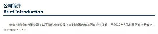 蔷薇控股官网显示,公司由16家国内知名民营企业发起,于2017年7月24日正式注册成立,注册资本118亿元。