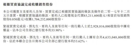 惠陶集团发布的收购公告显示,2017年12月5日,邓先生(邓有声)、基爵国际及其一致行动人(以下简称“一致行动人”)持股比例合计从33.90%升至53.62%。
