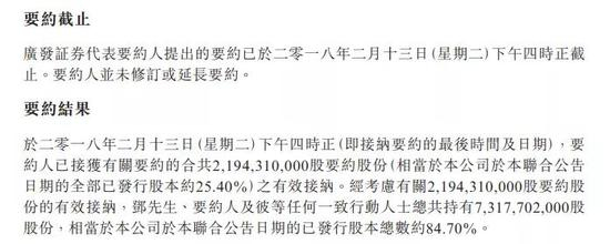 惠陶集团发布的公告称,2018年2月13日,前述要约截止,一致行动人持股比例达84.70%。