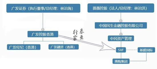 中民投既是蔷薇控股的股东(持股比例为8.4746%),又通过中民投亚洲-中民金融-中民资产管理这条线,最终连上SVF,以及收购惠陶集团的事件。