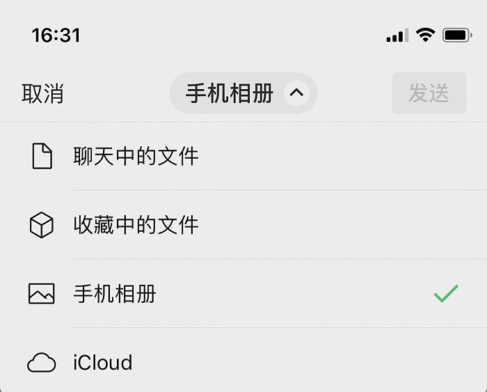 文件位置分为4类:聊天中的文件、收藏中的文件、手机相册、以及iCloud中的文件。