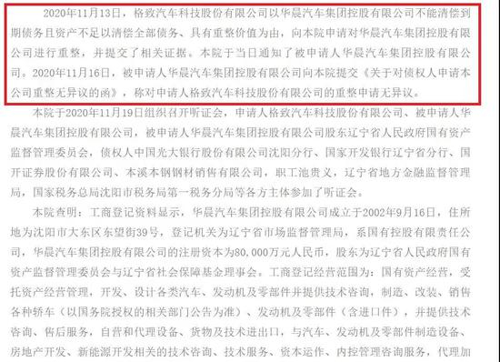 11月20日,沈阳市中级人民法院裁定,受理债权人格致汽车科技股份有限公司对华晨汽车集团控股有限公司(下称“华晨集团”)重整申请,标志着这家总资产1933亿的老牌车企,正式进入破产重整程序。