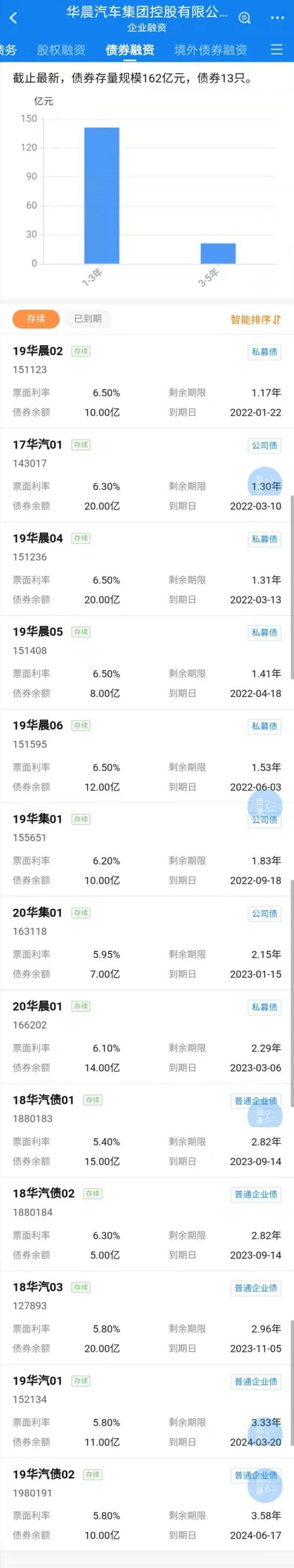 公开信息显示,除“17华汽05”外,华晨集团未偿还债券还有13只,余额为162亿元。从到期分布情况来看,2021年、2022年将是债券到期及回售压力的集中期。