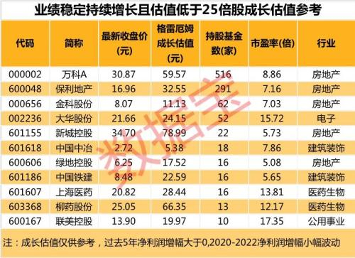 按照成长估值公式计算发现,当前股价低于成长估值个股有57只,而这57股中2015年至2019年净利润增幅均大于0,且最新持股基金超过10家,成长估值较当前股价溢价超过10%的仅剩11股,主要分布在电子、建筑装饰、医药生物等行业,包括万科A、联美控股、大华股份等。部分个股的成长估值较当前股价溢价较高,像柳药股份溢价率超过1.5倍,中国中冶溢价率超过95%,其中柳药股份2020年至2022年机构预测净利润增幅均超过20%。