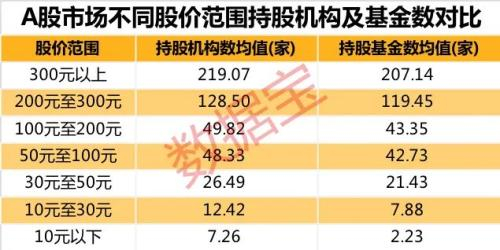 数据宝统计显示,A股市场上高价股是机构投资者的重点持有对象。百元以上股平均持股机构接近80家,其中超过200元股价的公司平均持股机构超过百家;300元以上股价的公司平均持股机构以及持股基金均超过200家;而低价股尤其是10元以下的股票持股机构数平均不到10家,持股基金数不超过3家。