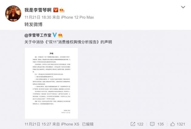 此外,李佳琦方面还感谢中消协的关注和监督,称这将帮助其更好地做好双十一售后服务。
