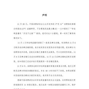 11月21日,针对中国消费者协会发布的“双11”消费维权舆情分析报告中案例:李佳琦直播间“买完不让换”,@李佳琦直播官方微博 回应称,消费者曾在11月6日将问题反映给品牌方和李佳琦直播间,厂商因为当时货品已售完无法换货,进行了退款,直播间一直与品牌方积极协调做好售后。如果对目前的售后解决方案仍有意见,会负责到底。