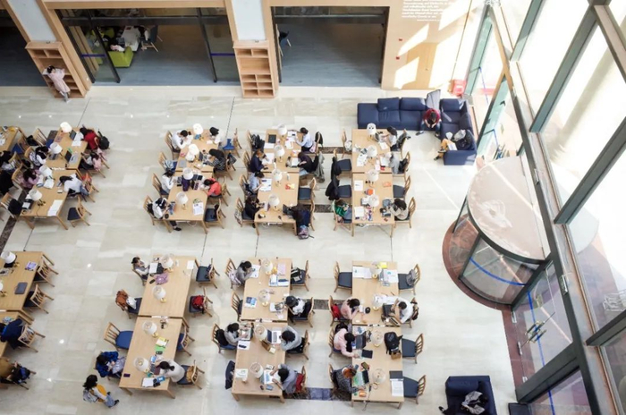 这里是上海商学院图书馆。窗明几净的玻璃,映射出同学们端坐其中、努力钻研的身影。