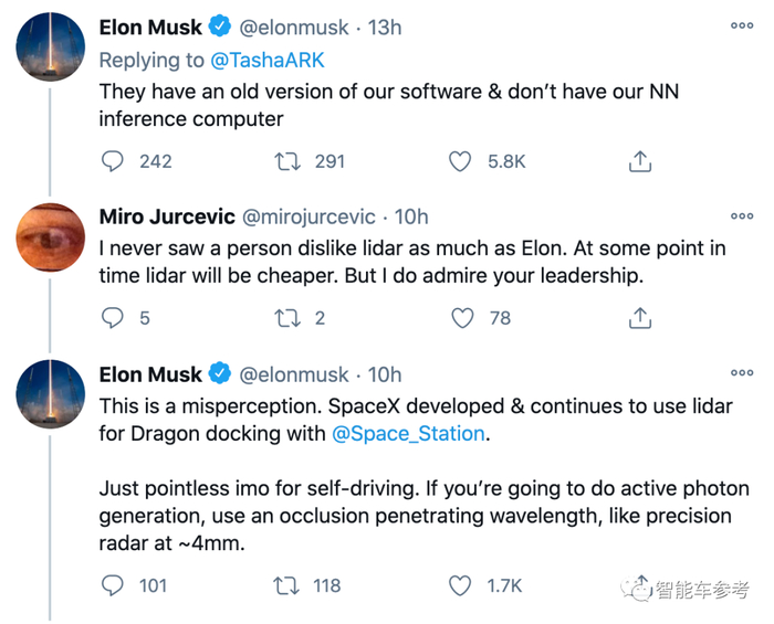 马斯克则回复,并不是自己对激光雷达有偏见。