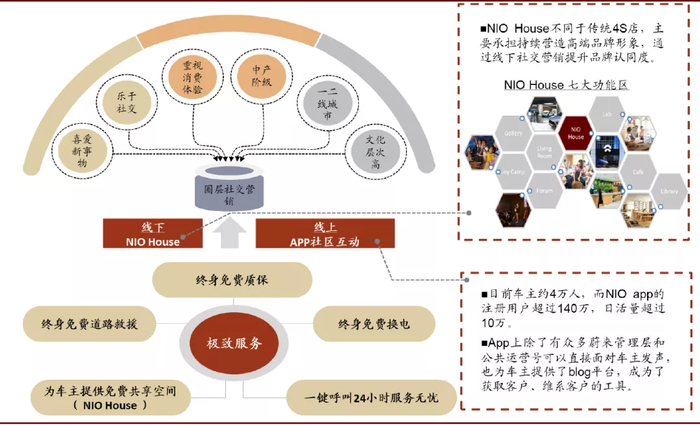 蔚来并没有直接降价来解决贵的问题,而是通过提供极致服务、圈层营销,使“贵”合理化。一方面,蔚来提供全面、极致的售后服务体验,包括终身免费道路救援、终身免费质保、终身免费道路换电、免费共享空间等;另一方面,线下NIO House和线上APP社区齐发力,利用圈层社交营销,提升品牌认可度,塑造高端形象,使“贵”合理化。