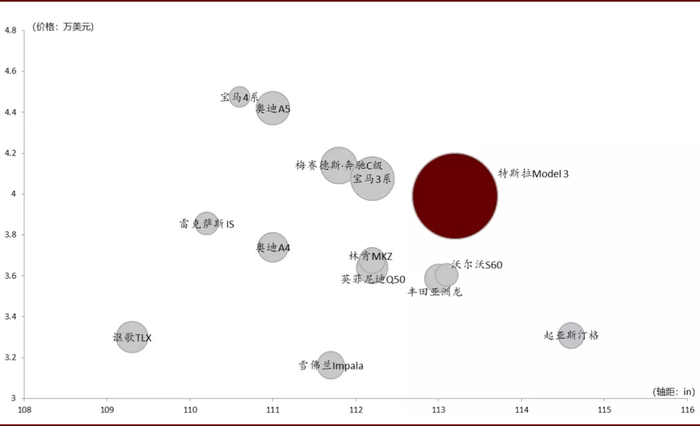 图表: 北美市场中, Model 3价格更低、轴距更长,对入门级豪车挤出效应明显(1H20)