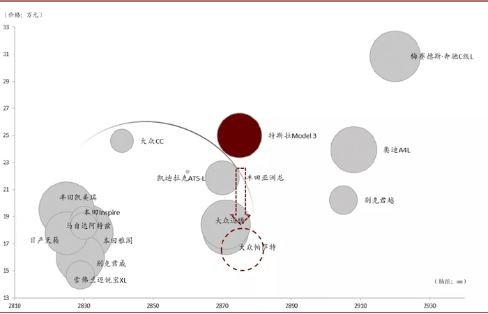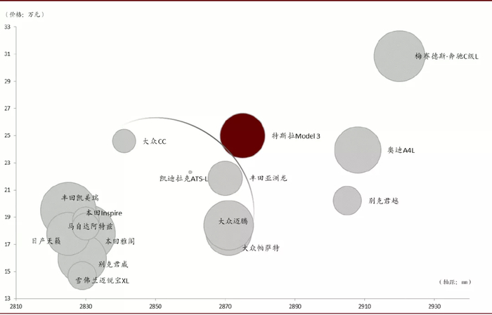 在中国市场,BBA销量较好的车型大多为加长轴距的车型,因此,与豪华车相比,Model 3在中国的优势不如美国明显;同时,在相同轴距的中端车型中,Model 3的定价也无优势。