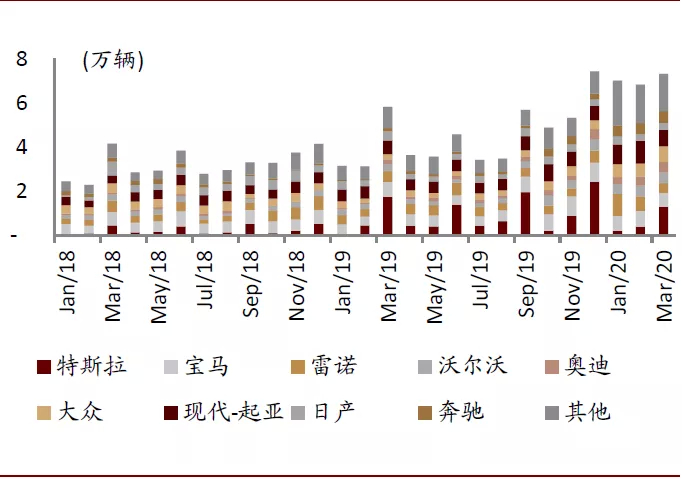 考虑国内限牌城市对新能源车的上牌政策,特斯拉则体现出了高性价比:以上海为例,Model 3补贴后售价约为25万元,上海燃油车车牌拍卖价格约9万元,扣除燃油车车牌成本,特斯拉裸车价格则等同于价格约为16万元的燃油车。从上牌量数据来看,特斯拉的销量集中分布在发达及限牌城市,我们认为限牌城市新能源汽车牌照成本较低、发达城市和限购城市新能源汽车充电桩铺设较广均是主要原因。因此我们认为在限牌城市中,特斯拉将直接影响大众、丰田等中端品牌的市场。