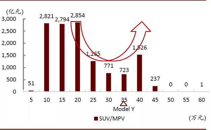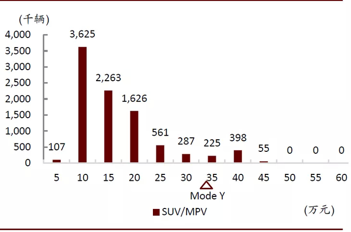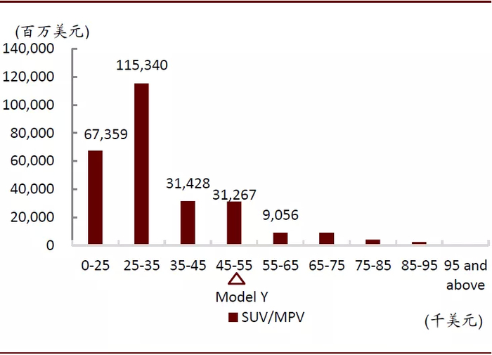 美国SUV市场主要集中在单车价格2.5-3.5万美金的市场,随着价格的上升,销量和市场规模均呈现下降趋势。中国SUV市场10-20万元车型占据主流,但与中国轿车市场类似,中国SUV市场规模也呈“U”型分布,高端SUV也有相应市场。