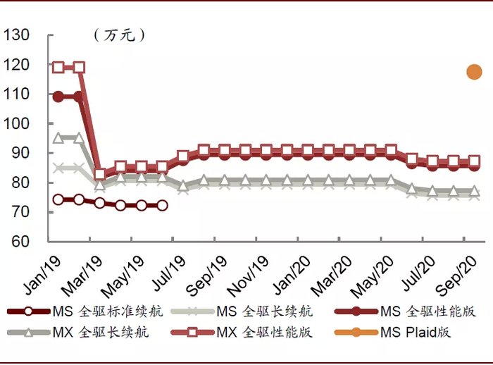 历史上特斯拉售价被视作为在手订单的调节工具,价格调节频繁。2019年至今,大多车型价格都调整了三次或以上。特斯拉各车型的售价长期来看是逐渐下降的过程,在新能源汽车退坡的环境下,价格下调更显示出其降本控费的能力,我们认为以价换量或成为特斯拉在中国市场近期的策略。