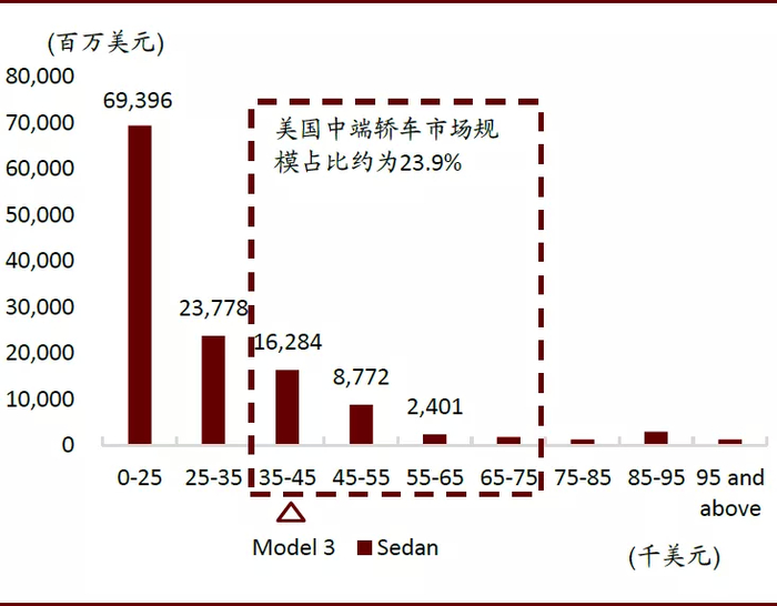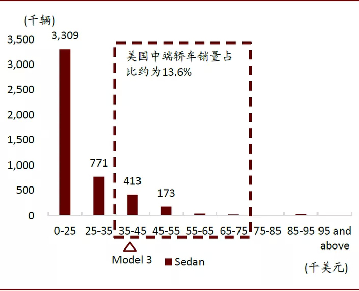 2019年,美国轿车仅占所有汽车销量的27.3%(SUV/MPV 为49.1%,皮卡17.7%,其余车型5.9%),而且中端轿车(厂商建议零售价在3.5万美元至7.5万美元之间的轿车)的销量约为65万辆,占美国轿车销量的13.60%,市场规模约为293亿美元,占美国轿车市场规模的23.85%。因此中级轿车在美国的销量占比仅有3.7%,属于细分市场。特斯拉Model 3在北美的售价处于中级轿车的入门级。