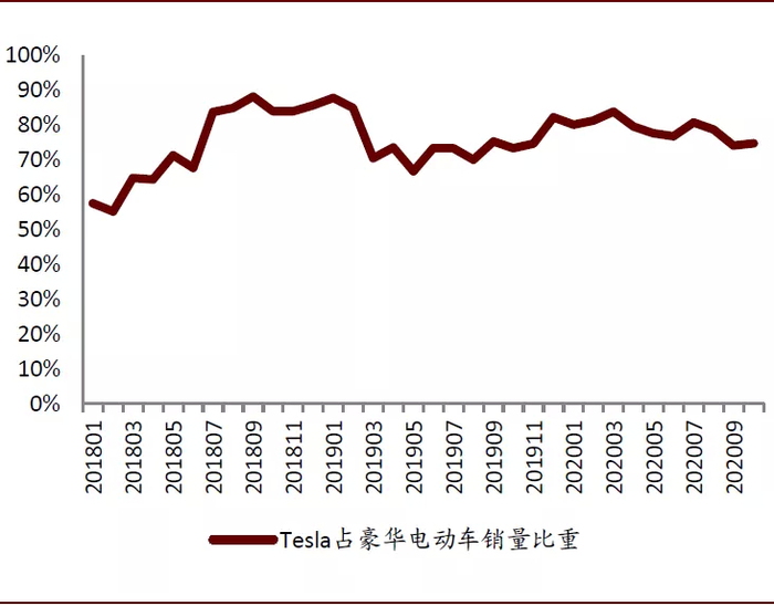 图表: 北美市场特斯拉在豪华品牌(EV)中的渗透率