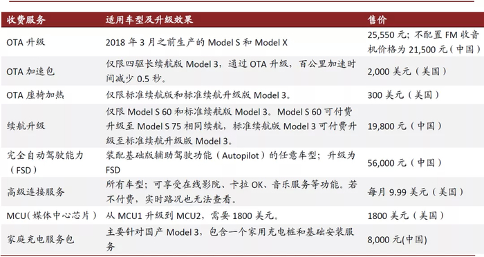 图表: 特斯拉推出的付费订阅服务简介