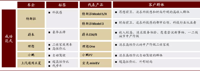 图表: 各新能源车企的标签、代表产品、客户群体