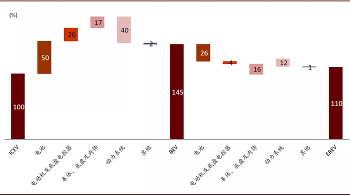 图表: EREV技术路线可缩小电动车与传统燃油车在整车BOM成本上的差距