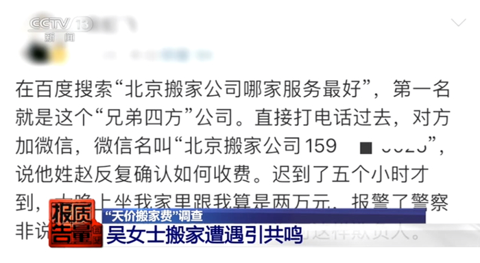 北京四方兄弟搬家公司被罚:千元费用坐地涨到1万8 还说不怕警察