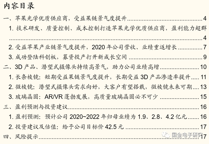 ◾ 长条棱镜业务短期受益苹果产业链景气度向好,长期受益于3D结构光产品渗透率提升。1)2019年公司长条棱镜营收为1.4亿元、占公司营收的42%,公司的长条棱镜主要用于3D结构光接收模组,下游客户为AMS集团,终端客户为苹果公司,得益于技术研发、质量控制、成本控制三大优势,公司出货量占AMS集团同类产品采购总量的80%以上。2)短期来看,我们认为苹果产业链景气度向好助力公司业绩高增长,长期来看,考虑目前3D结构光产品渗透率仍低(仅iPhoneX及以上产品使用),3D结构光在精确性较好,未来有望在更多机型采用。