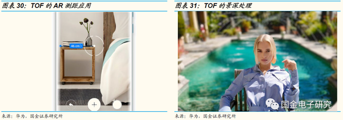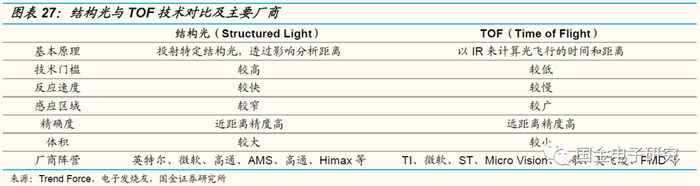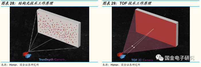 ◾ 结构光、TOF技术各具优势,应用不同。1)当前,3D感测技术主流的两种技术方案为3D结构光和TOF技术;2)3D结构光在近距离识别上精度更高, 2017年,苹果推出了基于3D结构光技术的iPhone X、3D结构光技术被用作前置摄像头人脸解锁的模组;3)TOF 具有结构简单,理论成本低,远距离精度高等优势, TOF技术在后置摄像头中主要起到实现AR技术、提升照相景深效果等功能;此外,除智能手机外,TOF在智能驾驶、机器人、智能眼镜、智能电视、智慧安防等领域都拥有广阔的发展前景。