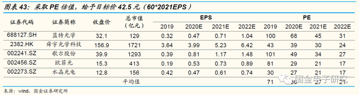 ◾ 我们选取舜宇光学科技、歌尔股份、欧菲光、水晶光电为公司的可比公司,考虑公司业绩增速更快、盈利能力更强,给予公司2021年60倍估值,对应目标价42.5元(60*2021EPS)。