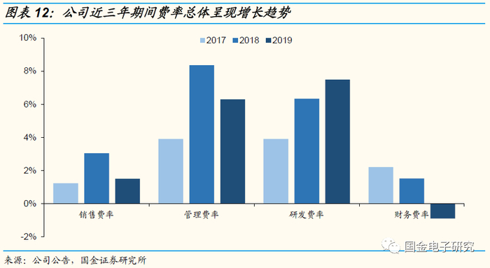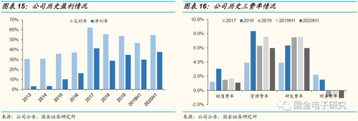 ◾ 公司盈利能力领先同业。1)公司近三年毛利率为62%/56%/54%;净利率为41%/29%/35%,远超同业。2)2018年公司净利率下滑主要系公司当年实施股权激励,对销售人员及管理人员分别确认股利支付费用0.06亿元、0.15亿元,2018年公司销售费率增长1.8pct至2.9%,管理费率大幅增长4.5pct至8.4%。