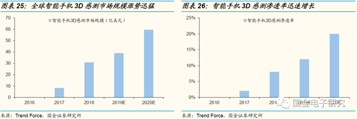 ◾ 智能手机3D感测市场自2017年起正式起步,规模涨势迅猛。根据Trend Force数据,2018年全球智能手机3D感测市场规模为31亿美元,预计2020年将增至60亿美元,CAGR为39%;2018年智能手机3D感测渗透率为8%,预计2020年将增加12pct至20%,每5部智能手机就有一部拥有3D感测功能。