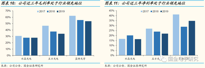 ◾ 苹果光学优质供应商,受益果链景气度提升。1)公司是苹果3D结构光双面红外反射棱镜(以下简称“长条棱镜”)核心供应商,预测在大客户同类产品采购量中占比80%以上。长条棱镜是公司的主要产品,2019年公司为苹果供应的长条棱镜收入占比达42%,2019年公司毛利率达54%、净利率达35%,盈利能力远超同业。2)2020年1-9 月,受益客户终端产品需求提升,长条棱镜及显示玻璃晶圆销售大幅提高,公司营收同增39.9%、归母净利同增58.5%。