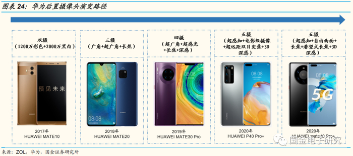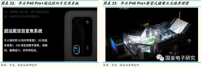 ◾ 潜望式摄像头能够在实现高倍光学变焦的同时不牺牲手机厚度,近年来成为各大手机厂商布局重点。1)根据变焦的形式,光学变焦可以分为内变焦和外变焦两类方案。内变焦(潜望式变焦)指前后镜片之间的距离不变,由之间的镜片组前后移动变焦,简单理解就是变焦在机身内完成,摄像头外观没有变化;而外变焦则是通过前镜片组和后镜片组移动变焦,类似于我们平常见到的伸缩式镜头。由于长焦镜头结构复杂,在机身轻薄化的趋势下,5×以上光学变焦将无法避免潜望式摄像头方案。2)HOVM各品牌今年旗舰机均有配备潜望式摄像头。P40 Pro潜望式长焦镜头内部结构设计显著改变并且更加复杂,通过放置新设计的棱镜与新采用的2面镜子延长光线在潜望式长焦镜头内的折射路径,实现10倍光学变焦。