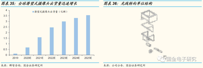 ◾ 受益潜望式摄像头渗透率提升,微棱镜市场需求扩增。潜望式摄像头较常规摄像头多一到两个光线转向元件,光线转向单元包括棱镜外壳、棱镜、棱镜座、支承轴套、支承轴、支承卡座。根据群智咨询数据,2019年全球潜望式摄像头出货量为0.1亿颗,预计到2025年全球潜望式摄像头出货量将增至3.6亿颗,CAGR为76%,增长十分迅速,作为潜望式镜头必要结构之一的转向棱镜需求也会随之扩增。