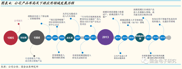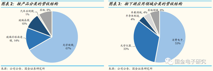◾ 公司自成立起广泛布局下游细分领域,当前已进入精密光学元件多元化布局的快速发展期。经过20多年的发展,公司产品已逐步应用于包括消费类电子、光学仪器、半导体制造及车载领域等在内的众多下游细分领域,2019年上述领域营收占比分别为53%、33%、4%、4%。