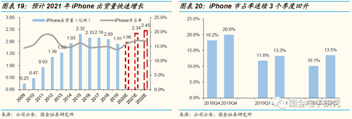 ◾ 展望2021年,预计公司营收、业绩持续高增长。考虑2019年末全球iPhone保有量超10亿台(超70%的用户仍使用2017年及更早的机型),叠加5G版手机推出,预计2021年是iPhone换机大年。预计2021年iPhone出货量增速近20%,助力公司营收持续高增长。