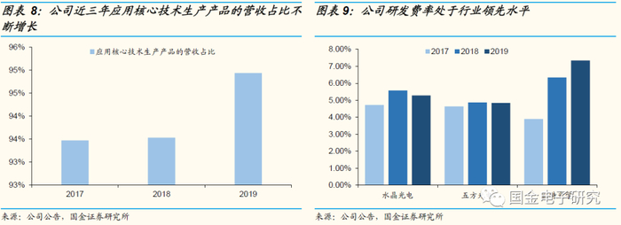 ◾ 技术优势:1)光学元件的性能优劣取决于其反射、折射、透过光线以及调整光路的精准度以及光电转换的效率,最终取决于光学元件达到的尺寸精度、角度精度、面型精度,以及可加工材料的折射率、透过率等参数。公司在工艺领域掌握了超高精度玻璃靠体加工、超高效大批量胶合切割等多项核心技术,并在主要产品的生产中加以综合运用,2019年,公司应用核心技术生产的产品营收占比为95%。2)公司在光学领域深耕二十多年,包括核心技术人员在内的专业团队对光学加工工艺具有独到的理解,积累了丰富的技术诀窍( Know How),使得近几年,公司在新产品研发及技改上不断加大投入,每年在研发费用上的投入均占到全年销售收入的4%以上,处于行业领先水平。3)以双面红外反射长条棱镜为例,双面红外反射长条棱镜专门用于苹果公司 3D 结构光人脸识别组件,公司产品在满足尺寸精度误差、 平行度和弯曲度均小于 5 微米、 PV 值小于 0.1λ、 反射率大于 99%的参数条件下实现量产。自iPhone X起,公司成为苹果公司产品3D结构光组件中双面红外反射棱镜的最主要量产供应商,其出货量占AMS集团同类产品采购总量的80%以上。