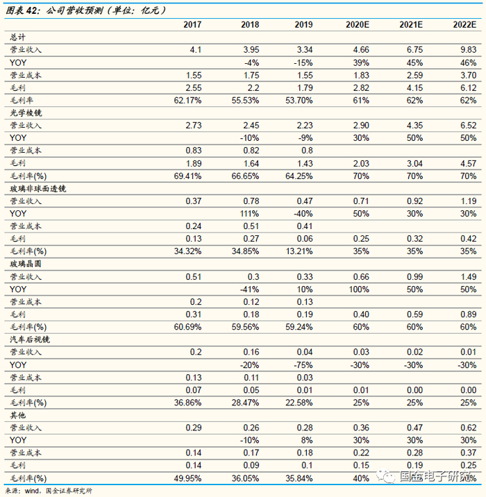 ◾ 预计公司2020~2022年营收为4.7、6.8、9.8亿元,同增40%、45%、46%。1)考虑苹果销量回暖、智能手机3D结构光渗透率持续提升,预计公司长条棱镜营收快速增长,伴随公司微棱镜逐步放量,预计公司光学棱镜营收快速增长;伴随高附加值的长条棱镜、微棱镜收入占比提升,预计公司光学棱镜毛利率提升至70%。2)考虑半导体行业、VR&AR产品需求蓬勃增长,预计公司玻璃晶圆业务快速增长,毛利率维持在60%的水平。3)假设公司非球面透镜、其他业务稳健增长,汽车后视镜业务持续缩量。