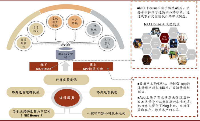 高举高打,极致服务,使“贵”合理化。蔚来并没有直接降价来解决贵的问题,而是通过提供极致服务、圈层营销,使“贵”合理化。一方面,蔚来提供全面、极致的售后服务体验,包括终身免费道路救援、终身免费质保、终身免费道路换电、免费共享空间等;另一方面,线下NIO House和线上APP社区齐发力,利用圈层社交营销,提升品牌认可度,塑造高端形象,使“贵”合理化。
