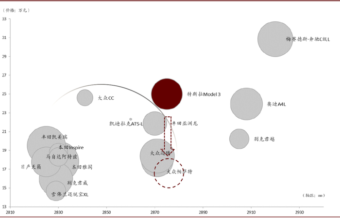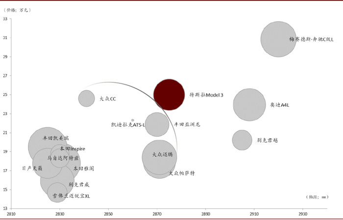 特斯拉在中国市场优势不如在美国市场明显:轴距小于豪车、性价比低于中端车。在中国市场,BBA销量较好的车型大多为加长轴距的车型,因此,与豪华车相比,Model 3在中国的优势不如美国明显;同时,在相同轴距的中端车型中,Model 3的定价也无优势。