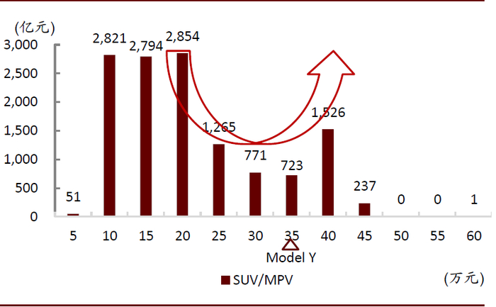 中国SUV市场规模呈“U”型分布,高端SUV亦有市场。美国SUV市场主要集中在单车价格2.5-3.5万美金的市场,随着价格的上升,销量和市场规模均呈现下降趋势。中国SUV市场10-20万元车型占据主流,但与中国轿车市场类似,中国SUV市场规模也呈“U”型分布,高端SUV也有相应市场。