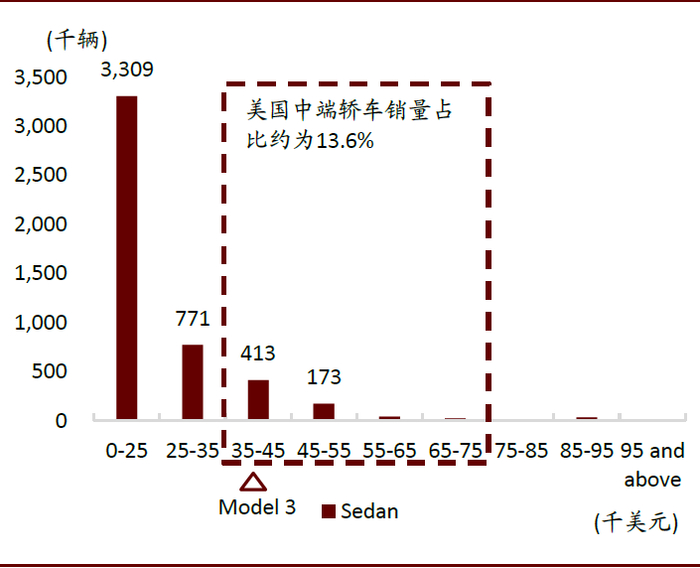 北美轿车市场较小,Model 3的价格处于中级轿车的入门级。2019年,美国轿车仅占所有汽车销量的27.3%(SUV/MPV 为49.1%,皮卡17.7%,其余车型5.9%),而且中端轿车(厂商建议零售价在3.5万美元至7.5万美元之间的轿车)的销量约为65万辆,占美国轿车销量的13.60%,市场规模约为293亿美元,占美国轿车市场规模的23.85%。因此中级轿车在美国的销量占比仅有3.7%,属于细分市场。特斯拉Model 3在北美的售价处于中级轿车的入门级。