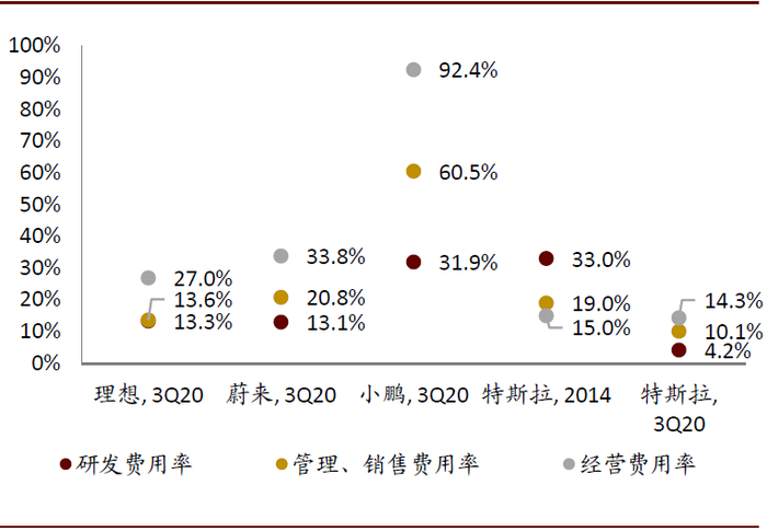 初创企业把有限的资金用在最能创造收益的地方才是最优选择。资金短缺是大多初创企业都会面临的问题,大多失败的造车新势力都是以资金链断裂却还没有量产产品为结局。但初创企业并非完全不能烧钱。例如,特斯拉发展初期面临较紧的资金约束,但是对于作为品牌标签的自动驾驶的研发投入依然较大。甚至2009年一度面临现金流枯竭困境,2010年公司拿到资金支持后研发投入进一步加大。2019年,特斯拉的研发费用率仍保持在较高水平(5.5%),与此同时,2010至2019年销售、行政及一般费用率逐渐缩减,2019年已达到11%以下。
